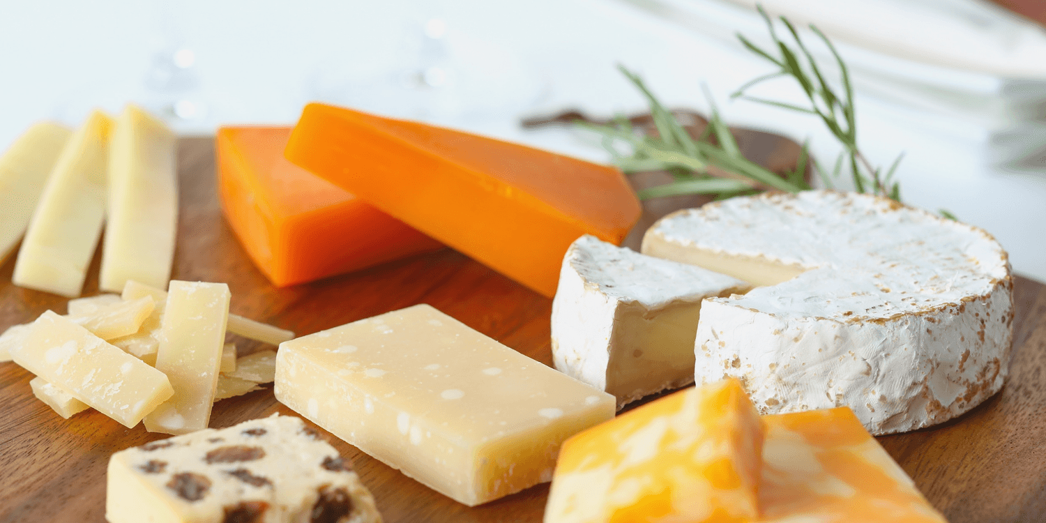 A trio of cheeses: sharp cheddar, blue, and triple-cream brie