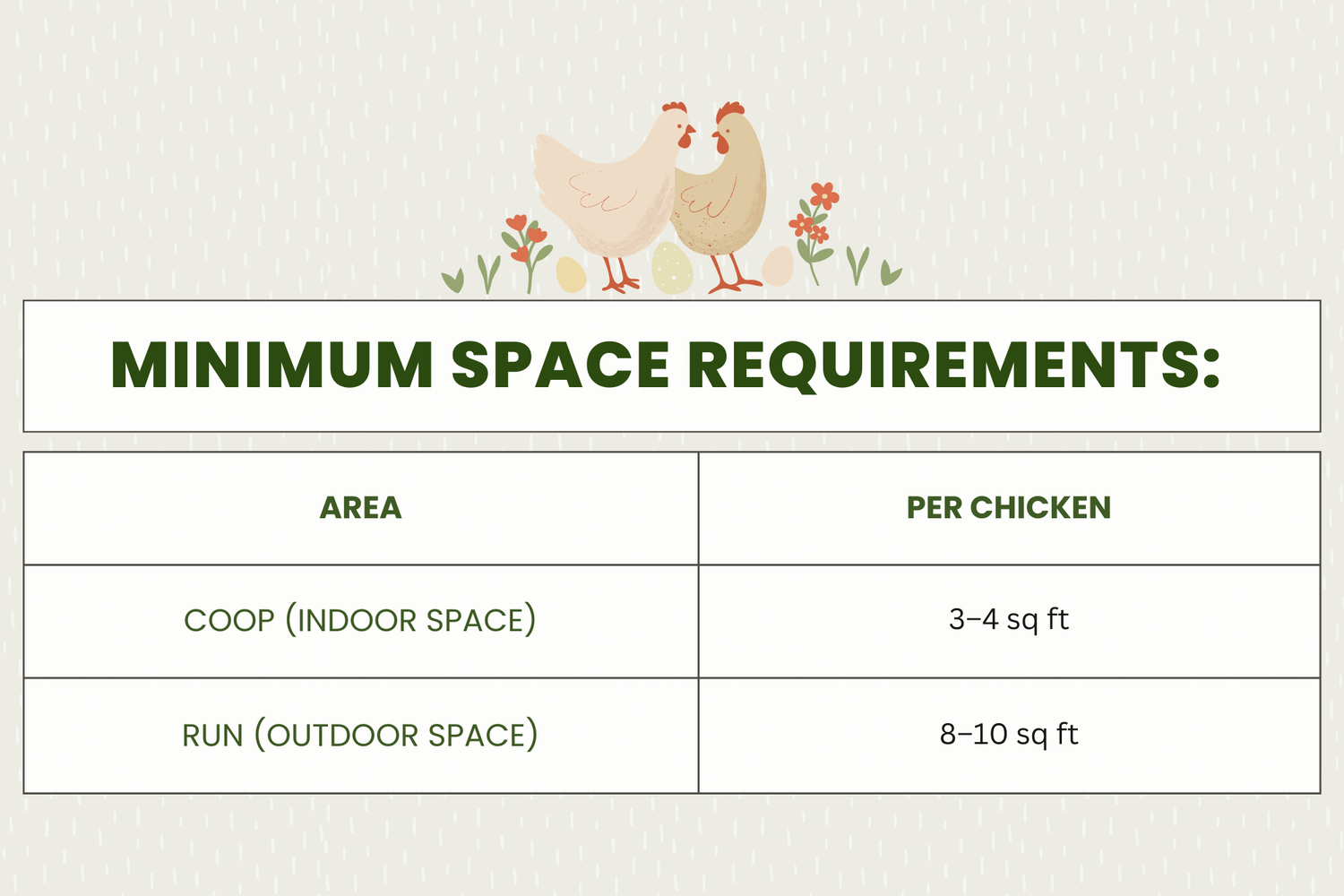 đ§ź Example: If your coop is 20 sq ft and your run is 80 sq ft, you can comfortably start with 5 chickens.